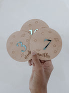 Celebrate your baby boy’s first year with our charming Clouds & Airplanes Engraved Baby Milestone Set. Designed for little adventurers, each of the 15 milestone discs is crafted from premium Australian timber, featuring engraved cloud and airplane illustrations, paired with stylish mirrored acrylic numbers for a modern touch.