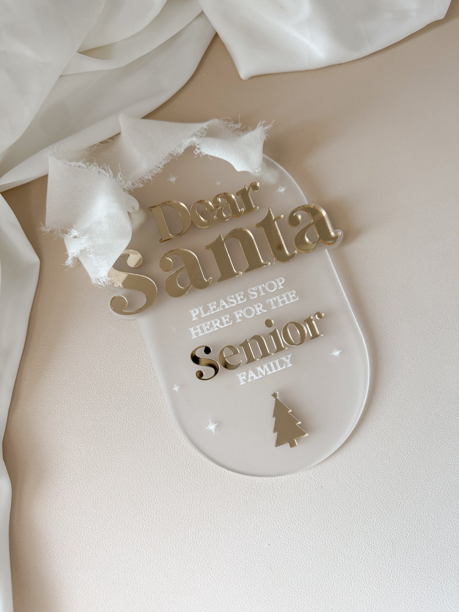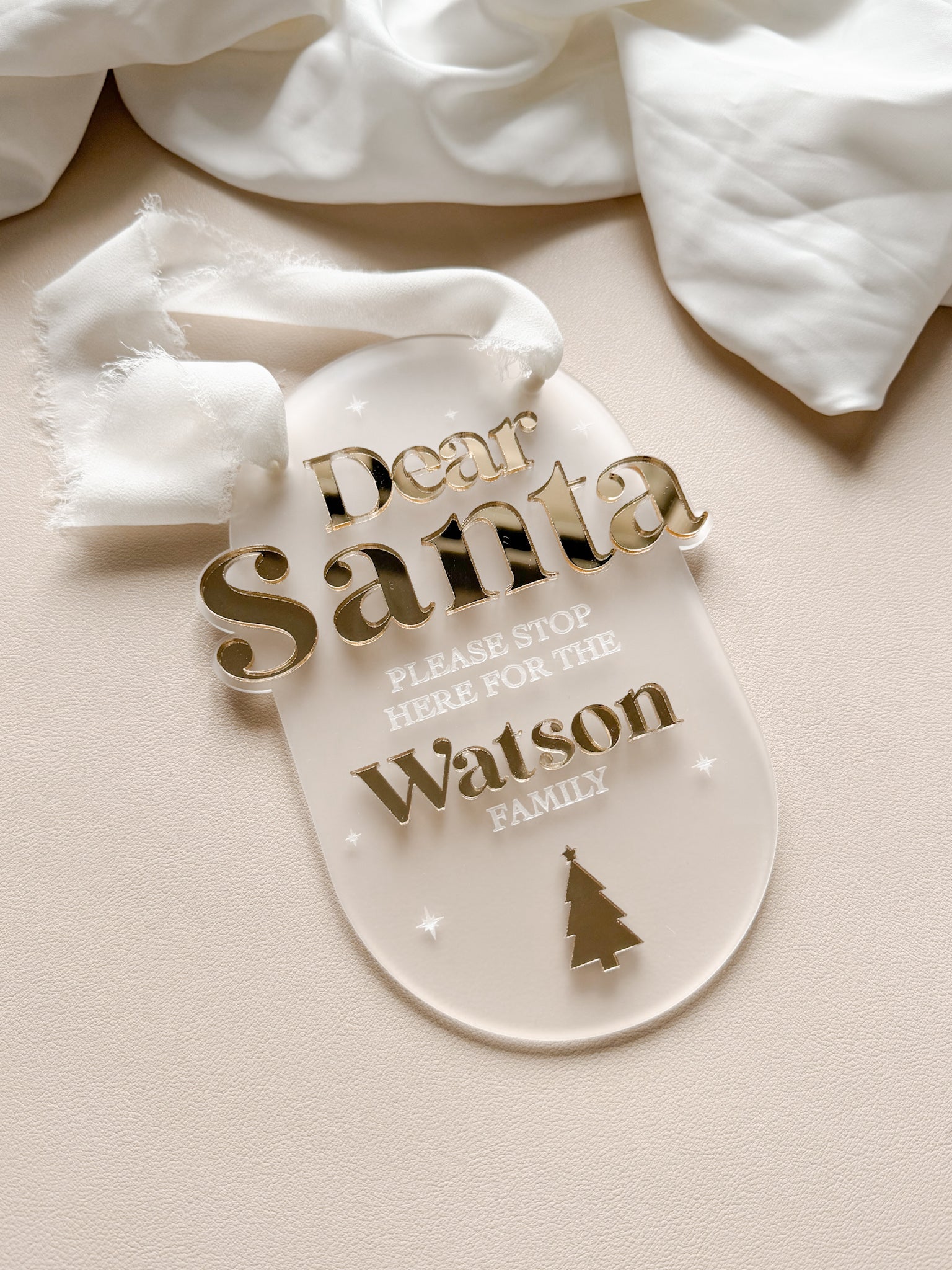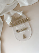 Add a touch of Christmas magic to your home with our personalised ‘Santa Stop Here’ sign. Crafted from premium frosted clear acrylic and finished with elegant gold mirrored acrylic text, this timeless piece is perfect for creating festive excitement on Christmas Eve.